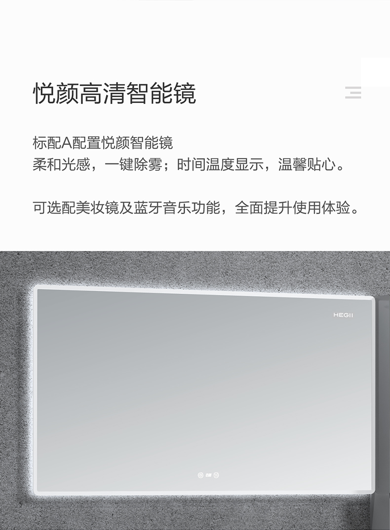 - 4、標(biāo)配悅顏系列多功能智能鏡,柔和光感,一鍵除霧,時(shí)間溫度顯示,溫馨貼心;