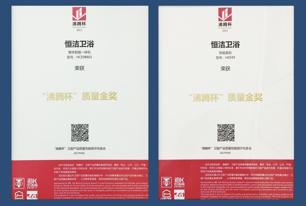品質驕傲!恒潔智能雙Q坐便器榮獲「沸騰杯」質量金獎